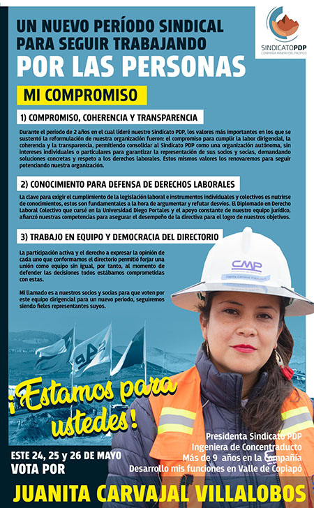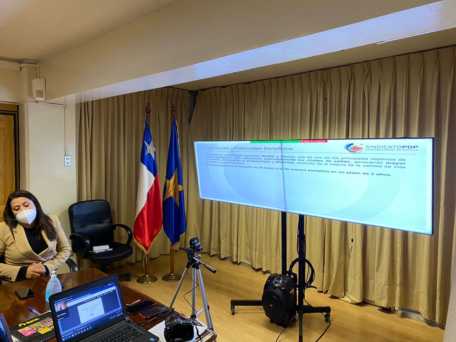 En esta instancia, nuestra presidenta expuso acerca de quienes conforman el mayor Sindicato de la Compañía, la priorización que tienen los trabajadores de Compañía Minera del Pacífico (CMP) de compartir a diario con sus familias, siendo esta, la razón principal porque el 99% de los asociados vive en las ciudades donde CMP tiene sus faenas. Las problemáticas de estrés argumentado por un estudio contratado a una consultora externa y la necesidad de adecuar la jornada de los supervisores en teletrabajo, quienes tienen en la actualidad exclusión de la limitación de jornada a pesar de que la Inspección del Trabajo ha cursado multas a CMP, además, se hizo presente los tiempos de traslados de los trabajadores desde las faenas hasta sus hogares, que puede tomar entre una a dos horas.