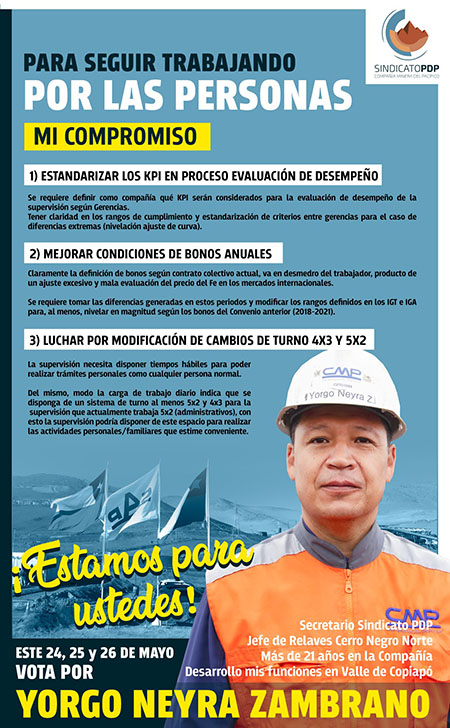 En consideración con el proyecto de Ley de 40 horas, nuestro Sindicato PDP lo visualiza positivamente, sobre todo en los puntos de vistas que tienen que ver con la salud mental, cuya reducción de horas beneficiaria a un porcentaje superior al 74% de los socios, viendo mejorada su calidad de vida directamente, producto de una mayor conciliación personal, familiar y laboral, que es uno de los principales objetivos de quienes trabajan en CMP, reduciendo ostensiblemente los niveles de estrés, generando mayor motivación, aumentando la productividad y eficiencia.