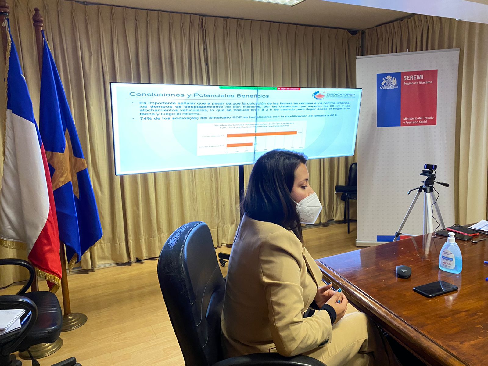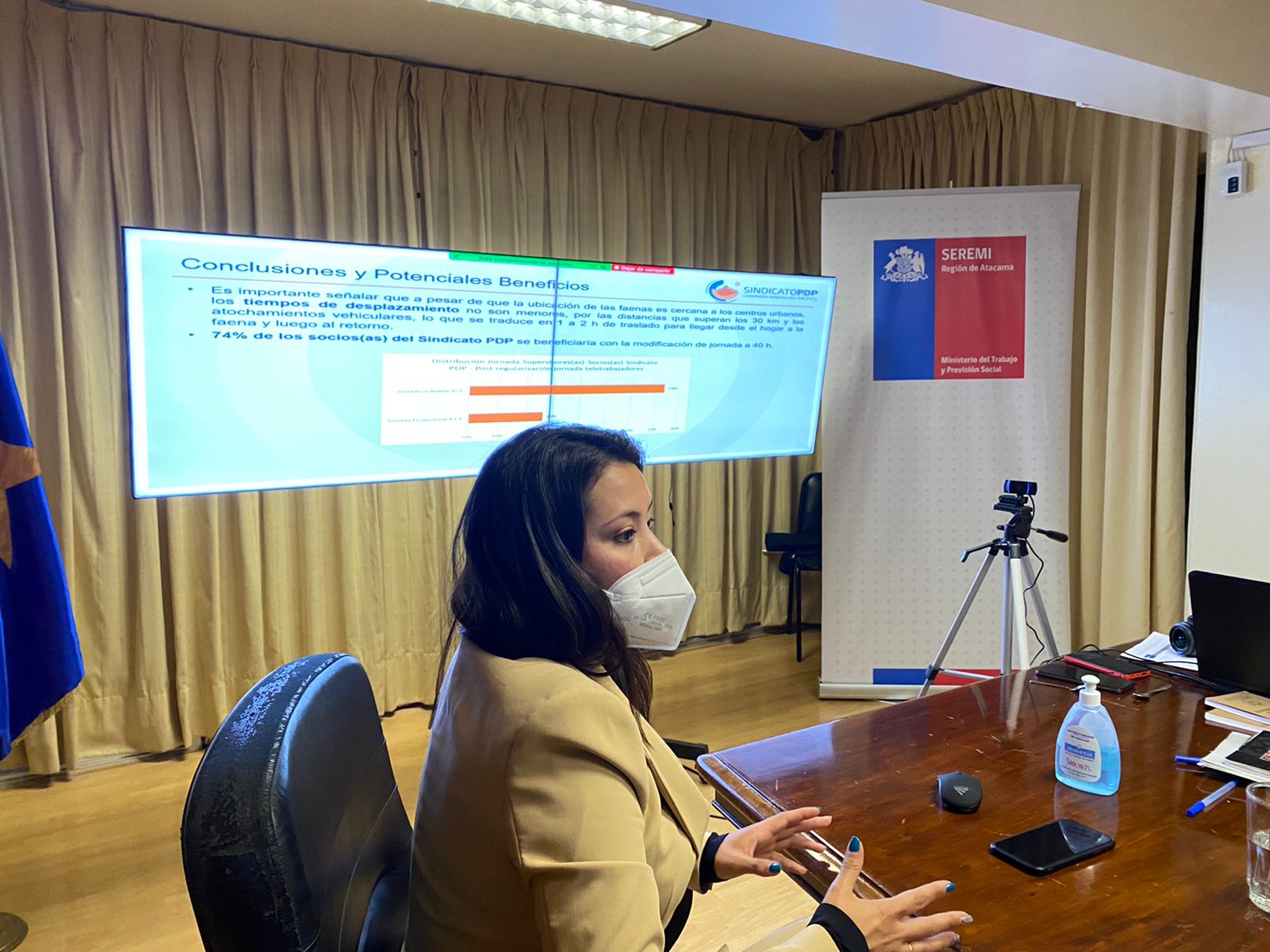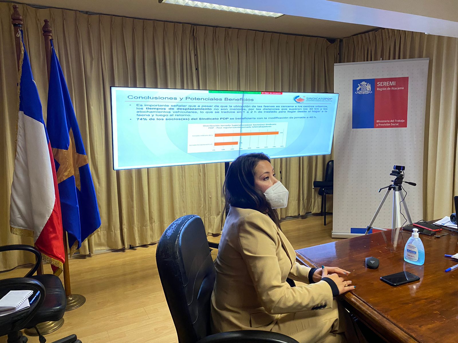 Como parte de la invitación del Ministerio del Trabajo y Previsión Social, Juanita Carvajal, presidenta del Sindicato PDP, participó de la mesa técnica de Atacama, donde se conocieron las propuestas y aportes de diferentes rubros con respecto a la jornada laboral. En esta reunión dirigida por la Seremi del Trabajo Sra. Gladys Cortés, estuvieron presente los asesores de la Ministra del Trabajo y del Subsecretario del Trabajo, representantes de Sindicatos, empresarios y académicos.