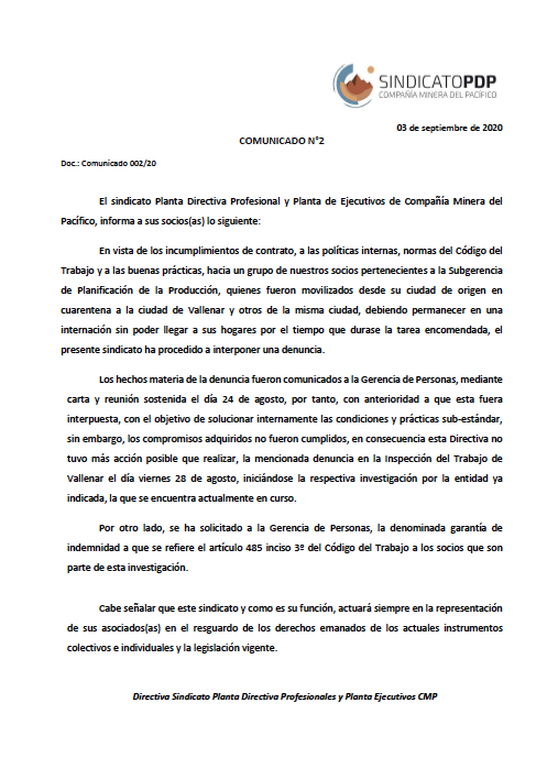 Detalle Reunión Sindicato PDP y Gerencia de Personas, 24 de Agosto de 2020