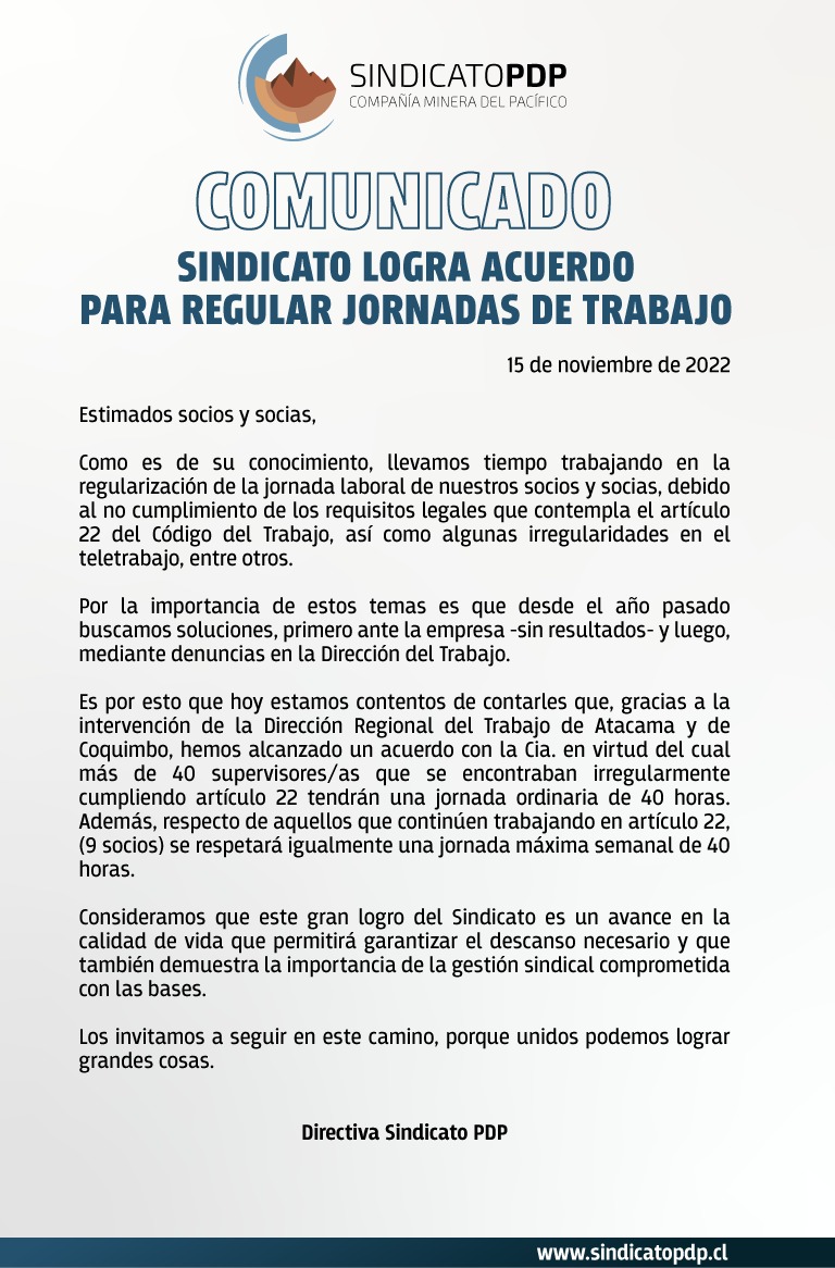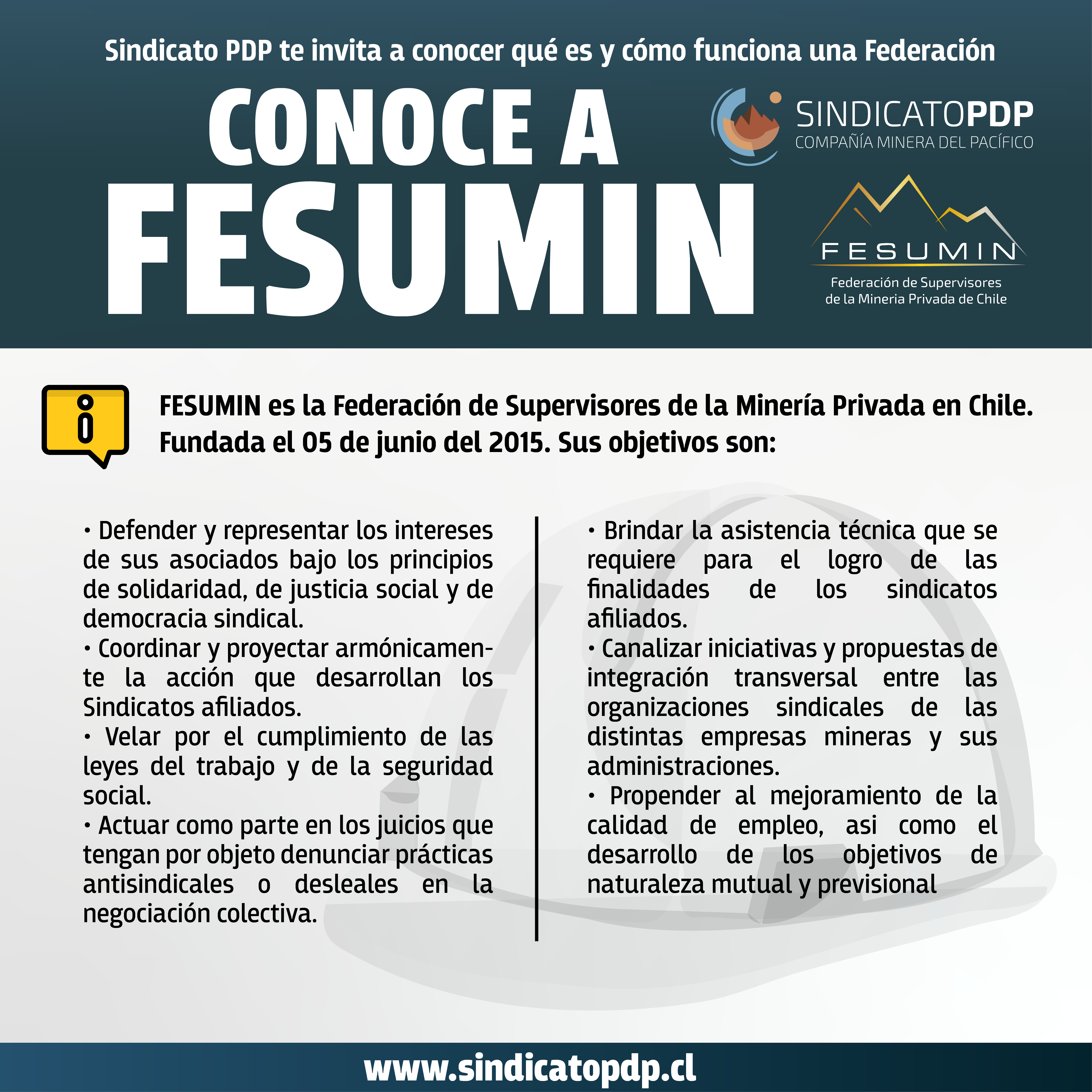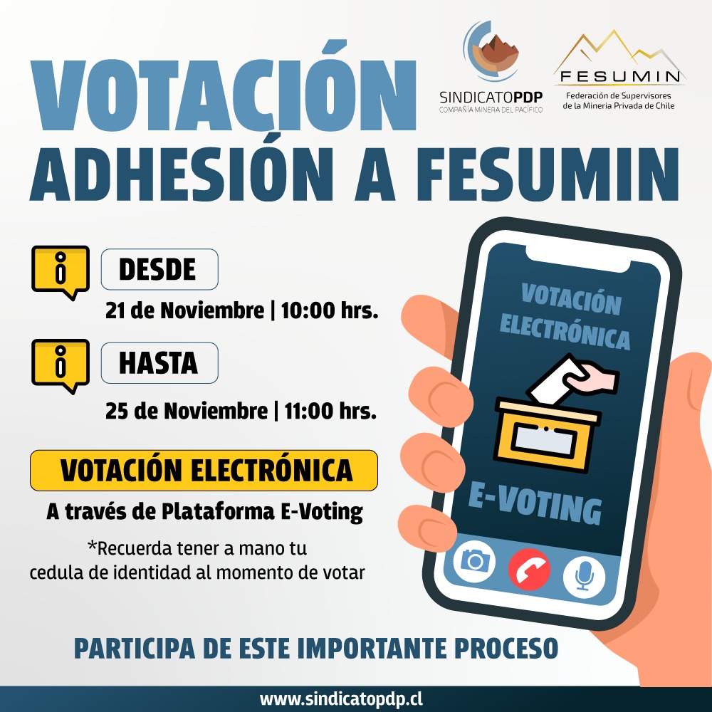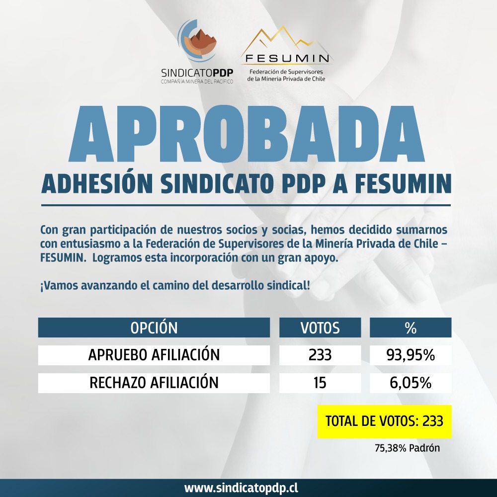 Nuestro sindicato ya cuenta con los trámites legales ante la dirección del trabajo para realizar el procedimiento democrático de votación que permitirá consultar a nuestras bases el ingreso a la Federación de Supervisores de la Minería Privada de Chile – FESUMIN.