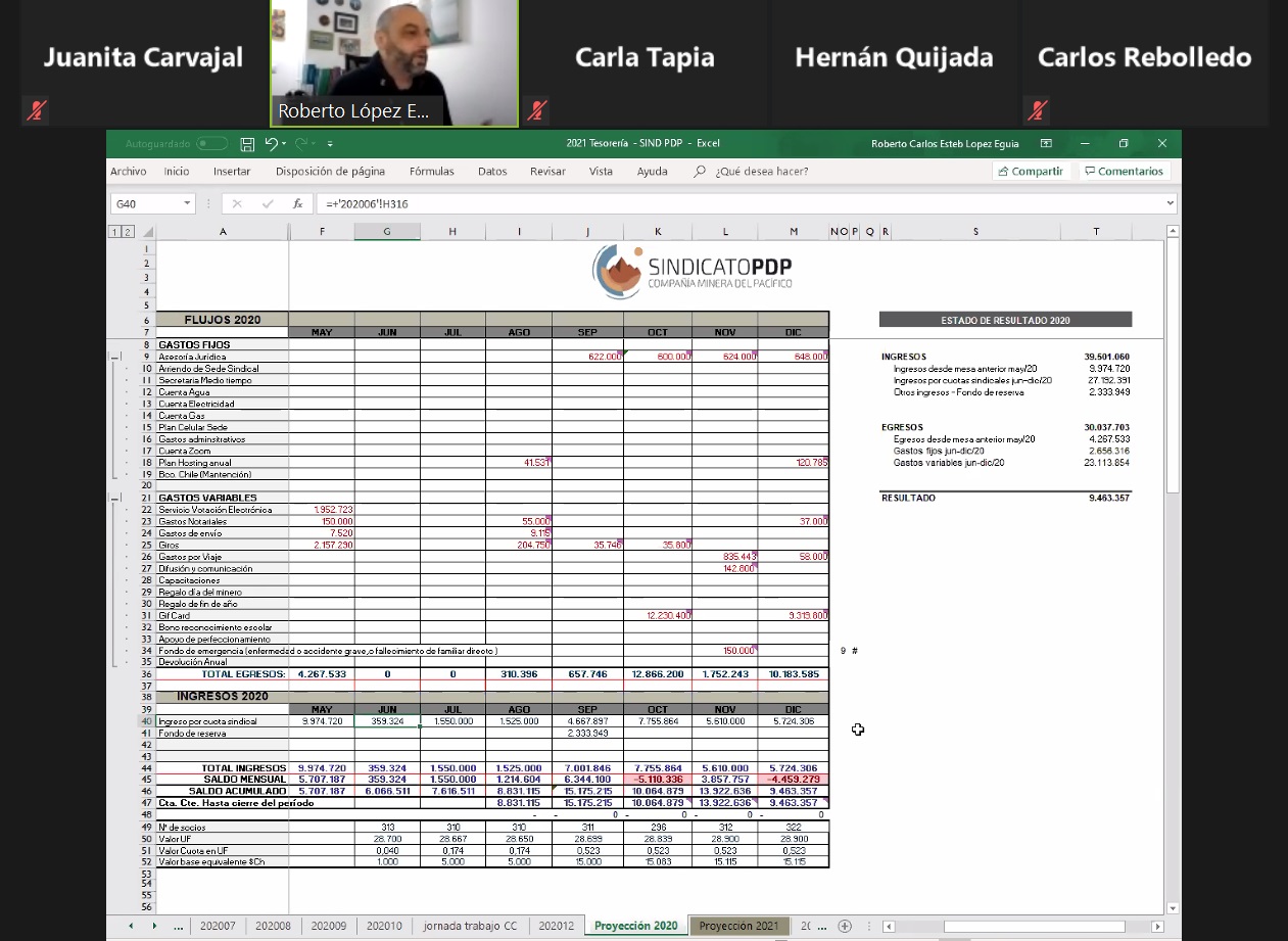 Con fecha 18 de junio, la Comisión Revisora de Cuentas conformada por Carla Tapia Guerrero de Valle de Elqui, Carlos Rebolledo Jimenez de Valle de Copiapó y Hernan Quijada Contreras de Valle de Huasco, conforme a lo establecido en los estatutos del Sindicato PDP, se reunieron para iniciar la auditoria de los gastos e inversiones de los fondos. En esta oportunidad, Roberto López Eguía, Tesorero, dio conocer el registro y respaldo de gastos de año 2020 a la actualidad y el presupuesto establecido para lo que resta del año 2021.