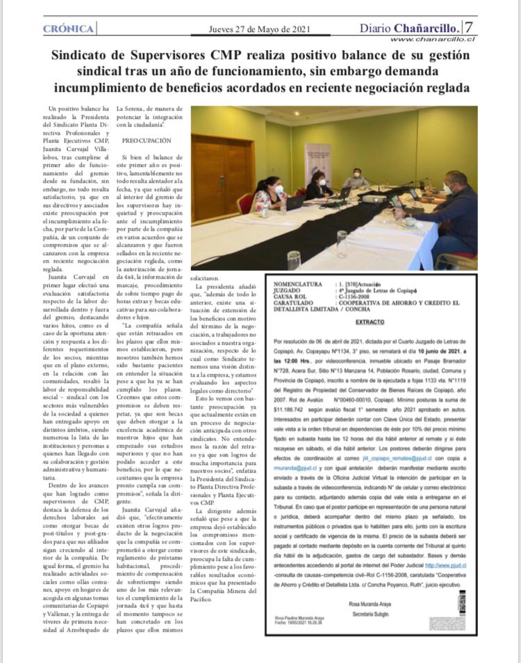 - Atacama Noticias > Link https://www.atacamanoticias.cl/2021/05/27/sindicato-de-supervisores-cmp-realiza-positivo-balance-de-su-gestion-sindical-tras-un-ano-de-funcionamiento-sin-embargo-demanda-incumplimiento-de-beneficios-acordados-en-reciente-negociacion-reglada/